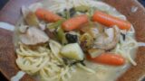 1.適当に切った鶏もも肉をオリーブオイルで焼く。パスタが茹で上がる少し前に、適当に切ったクレソンとルッコラを加え、薄く塩を振る。