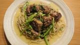 2.茹で上がったスパゲッティをフライパンに投入してバターを絡める。塩で味を整える。