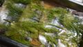 1.鯵のマリネをガスバーナーで炙って、皿に盛る。漬ける時に一緒に入れていたディルとニンニクを刻んで添えて完成・