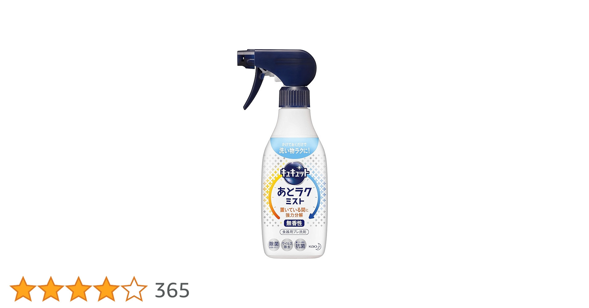 食後、食器をすぐ洗えない時にスプレーしておくだけ、置いている間にミストが浸透、汚れを落としやすく分解。あとで洗う時、汚れが簡単に落とせてラクに短時間で洗えます・・・というあとラクミスト。食洗機につっこんどけばええやん派の人だと、別にそんなんいらんくない?という感じだと思うのだけど、そうじゃない人にとっては、これいいなって思ったわけや。