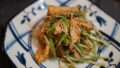 2.途中で手で割いたキノコを加えて炒め、味噌だれで味をつけて皿に盛り付けて完成。
