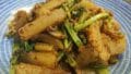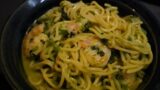3.平行して、フライパンに野菜ブロードとカレー粉を加えて火を加え、塩で味調整したのち、生クリームとガラムマサラを加えたのち、茹でたフェットチーネを加えて絡める。