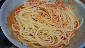 カラヒグ麺を使った、ゆかりバターシーフードスパゲッティ