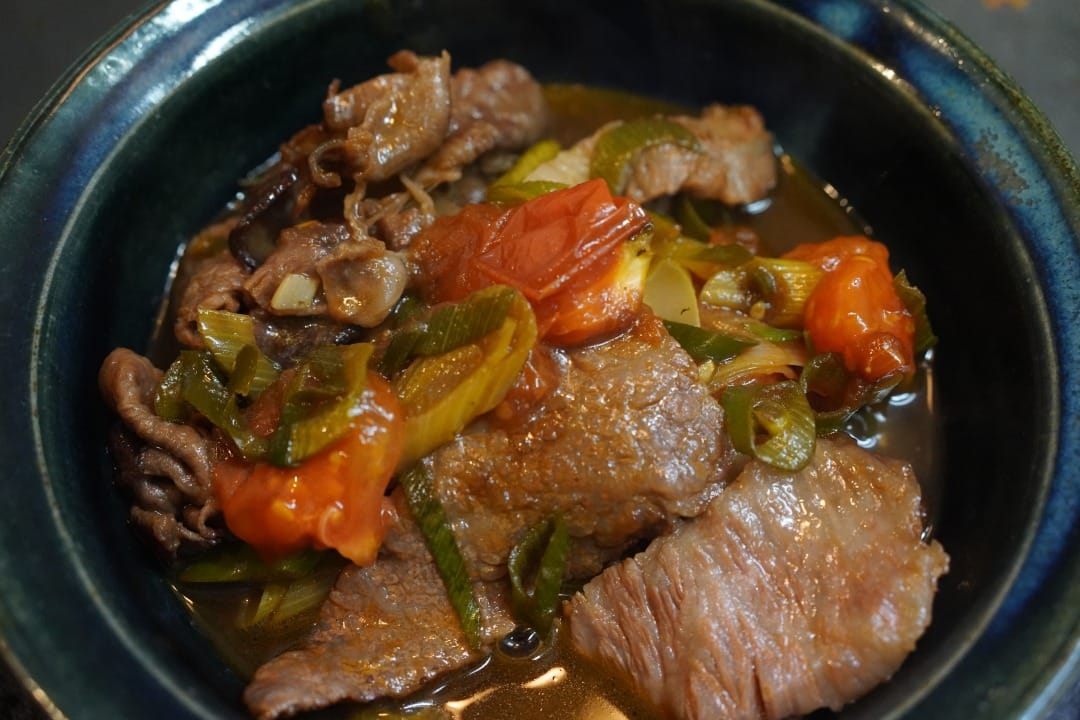 脂の強い牛肉とトマトの酸味と葱の旨味をすき焼きのタレで焼いて煮ていくそんなお手軽料理です。