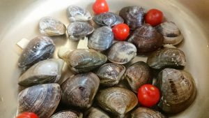 カラヒグ麺を使った、ゆかりバターシーフードスパゲッティ