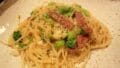 4.茹で上がったパスタとソースを合わせて絡めて、盛りつけて、パルミジャーノレッジャーノを軽く振って完成。