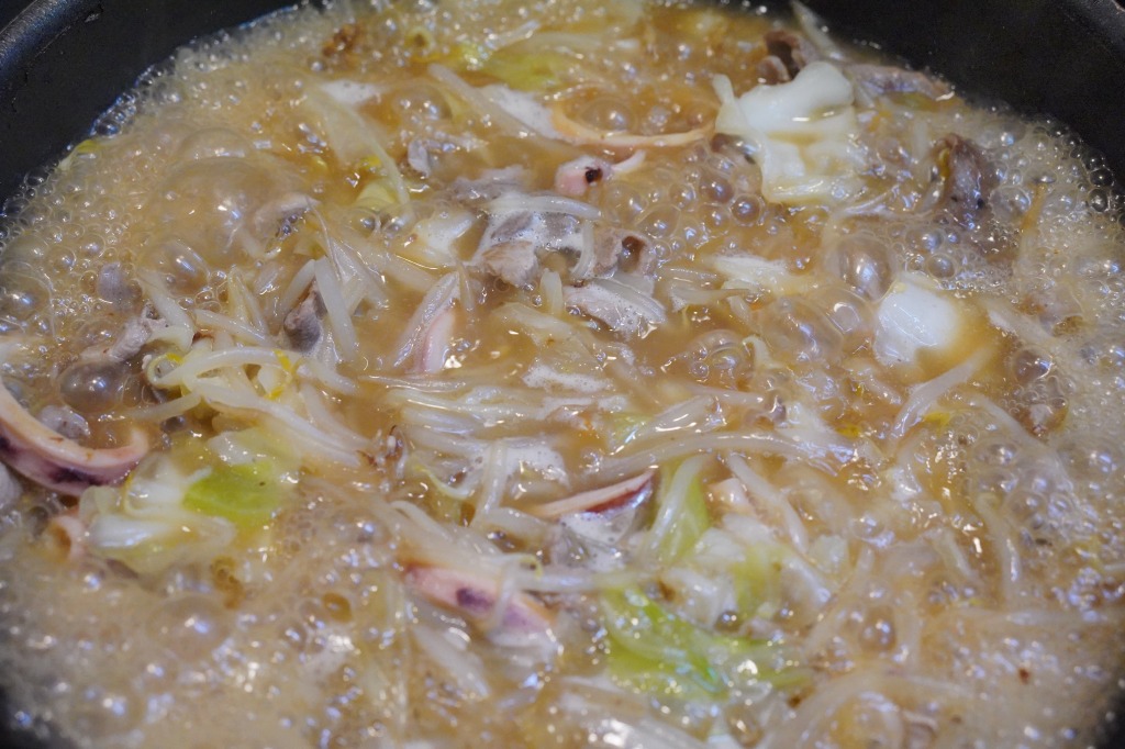 3.カラヒグ麺を生麺のまま加えて、スープで煮る。煮込み時間は2分。そのあとは、丼に盛り付けて完成。