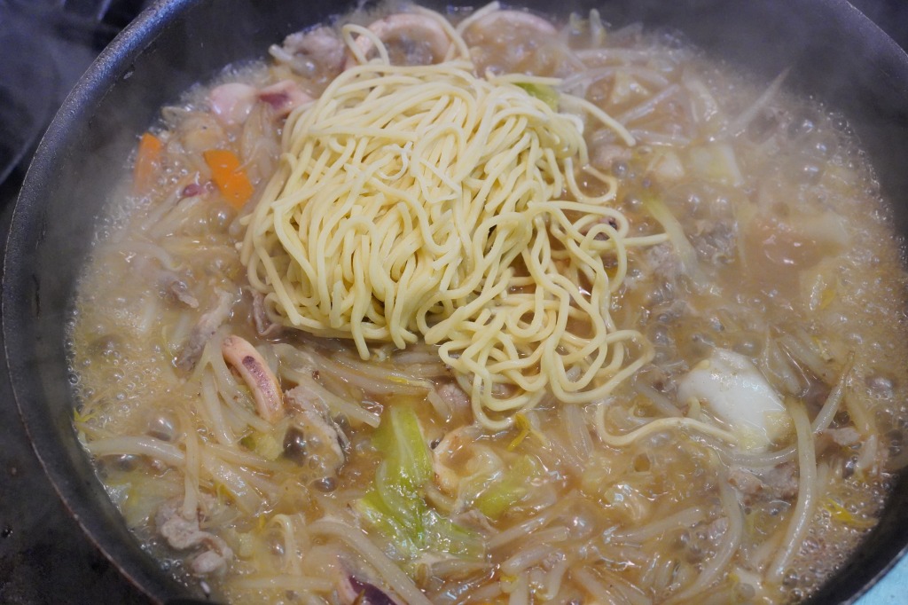3.カラヒグ麺を生麺のまま加えて、スープで煮る。煮込み時間は2分。そのあとは、丼に盛り付けて完成。