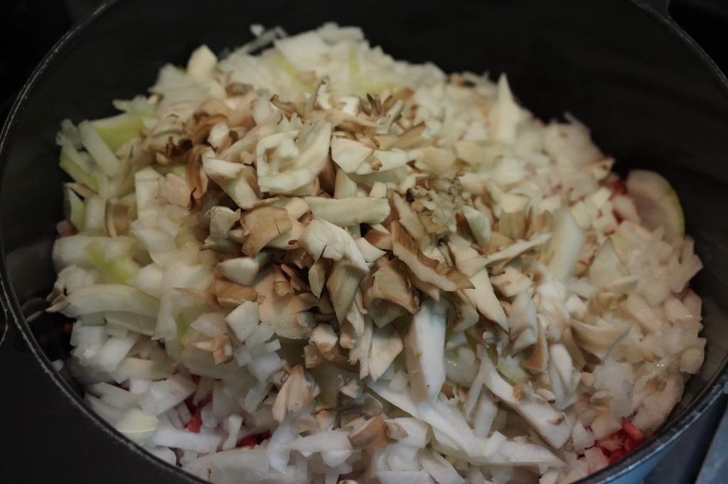 1.鍋に、下から挽肉→ざっくりみじん切りにした玉ねぎ→同じくみじん切りにしたニンニク→同じくみじん切りにした舞茸を重ねる。