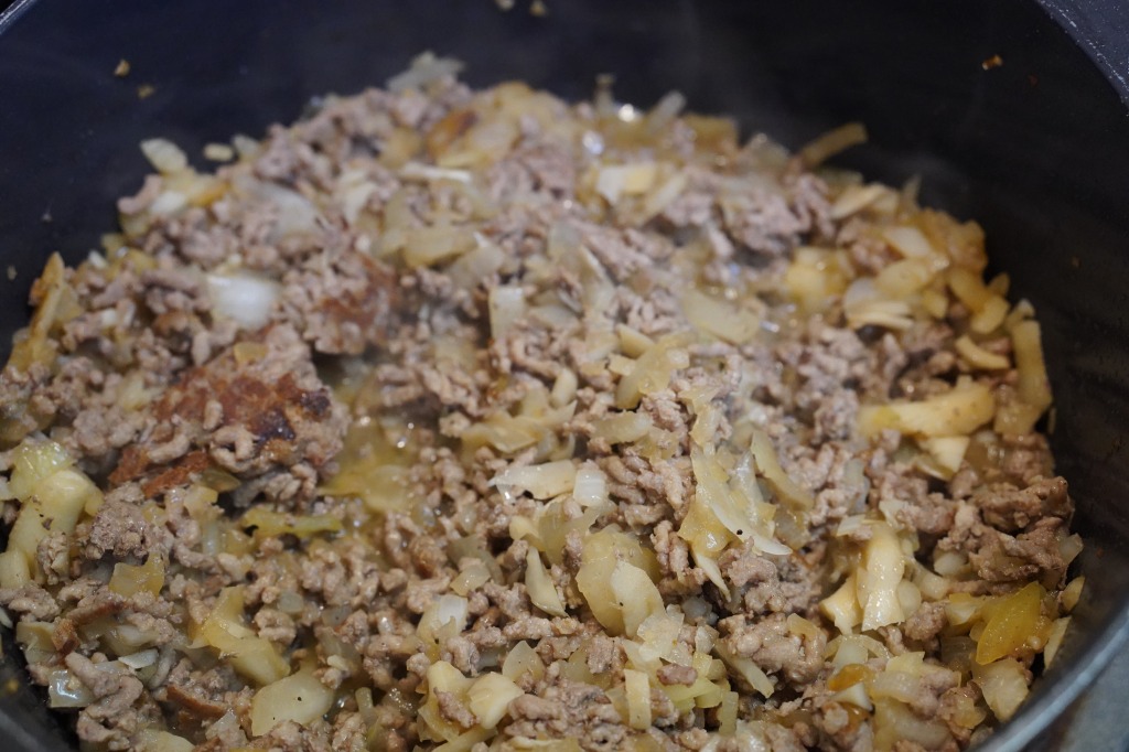 2.加熱する。挽肉が焦げるように焼けてくるまでは蓋をして加熱しますが、香ばしい匂いが立ってkたら肉の表面がしっかり焼けているので、ざっと混ぜ合わせながら炒める。この先は蓋は使いません。・