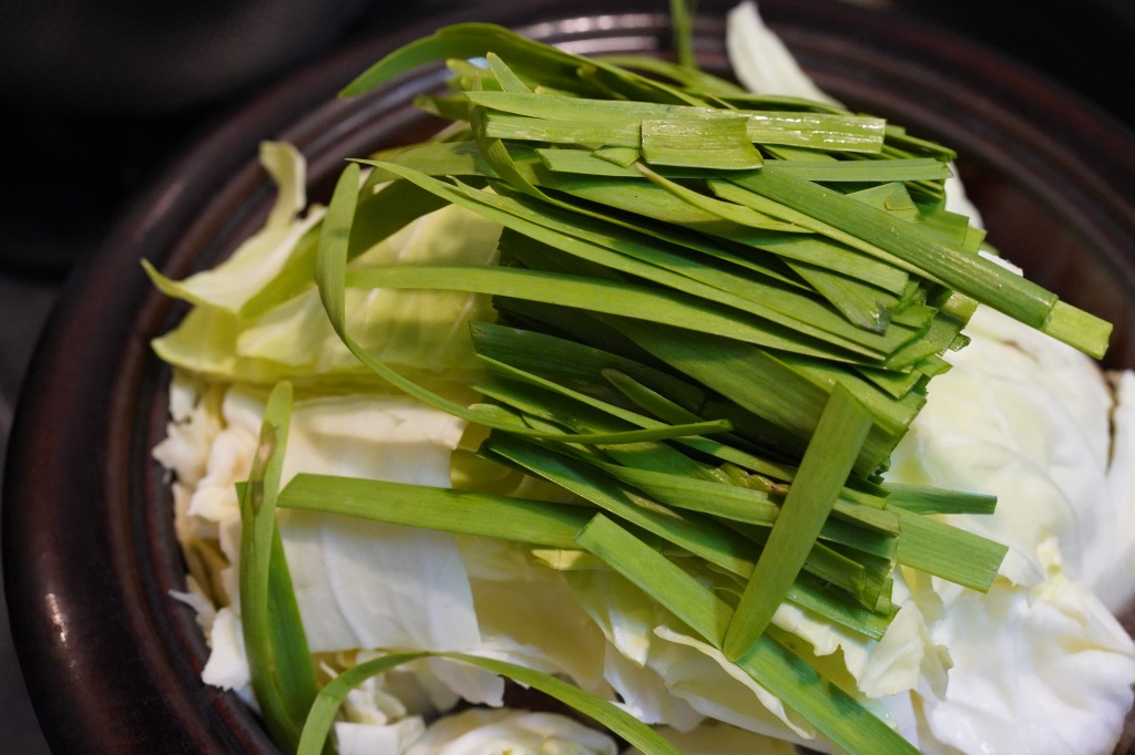 2.鶏もも肉、手でちぎったキャベツ、適当に切ったニラを盛り、蓋をして加熱して火が通ったら完成。鍋汁は、ちょっと濃いかな?くらいで正解。キャベツは蓋ができるかできないかくらいたくさん盛ってください。ちゃんと火は入るし、結局全部食べちゃうので。