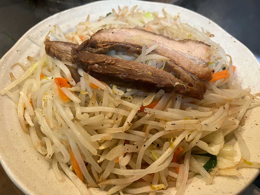 炒め最後あたりにチャーシューを入れて野菜炒めの中でちょっと温めてあげてから盛り付けに入るやり方もあり。でも、チャーシューはあくまで添え物なのでそこは注意。メインは野菜だし、塩だけで味を決めるってのがいいんです。そうじゃないと何食ってるかわからないけど、とりあえず旨い何かになってしまうので。