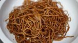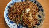 3.豚を角切りにして、鉄板に投入。麺が茹で上がったら麺も加えて焼く。軽く塩をふったのち、豚のたれをしっかりめに加えて絡めて焼いて、青のりをふって完成。