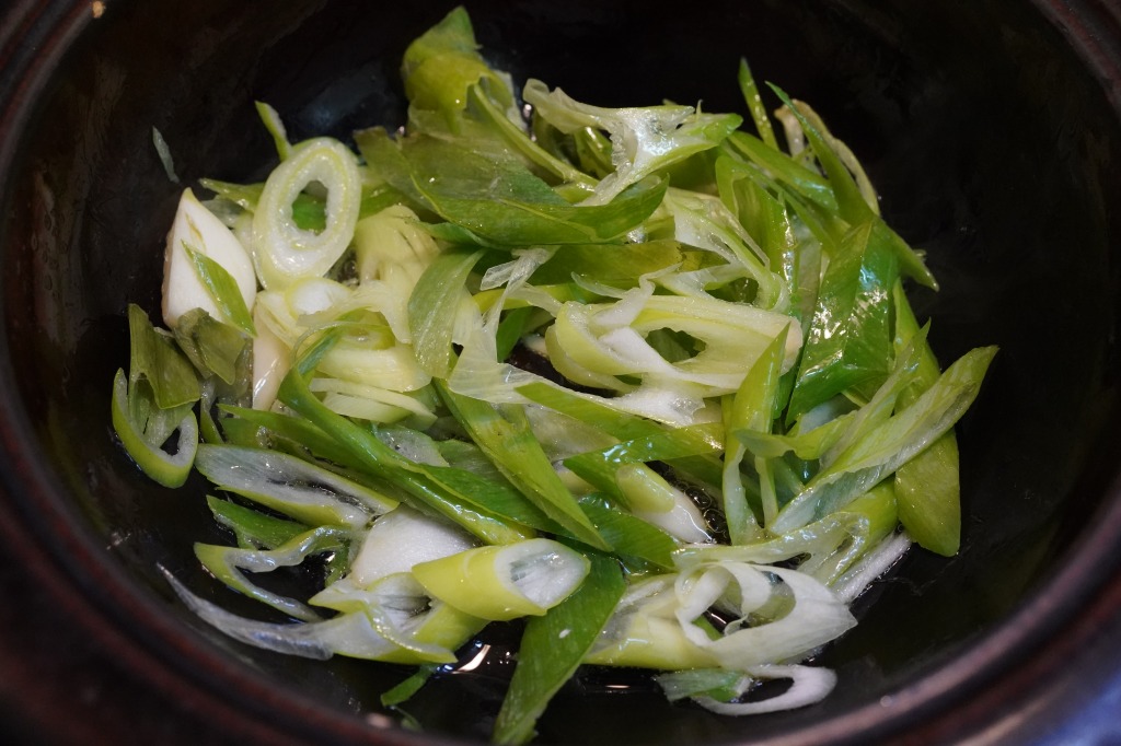 1.土鍋にごま油とざっくり刻んだニンニクとねぎの青い部分を加えて加熱。ニンニクもネギも焦がさない。