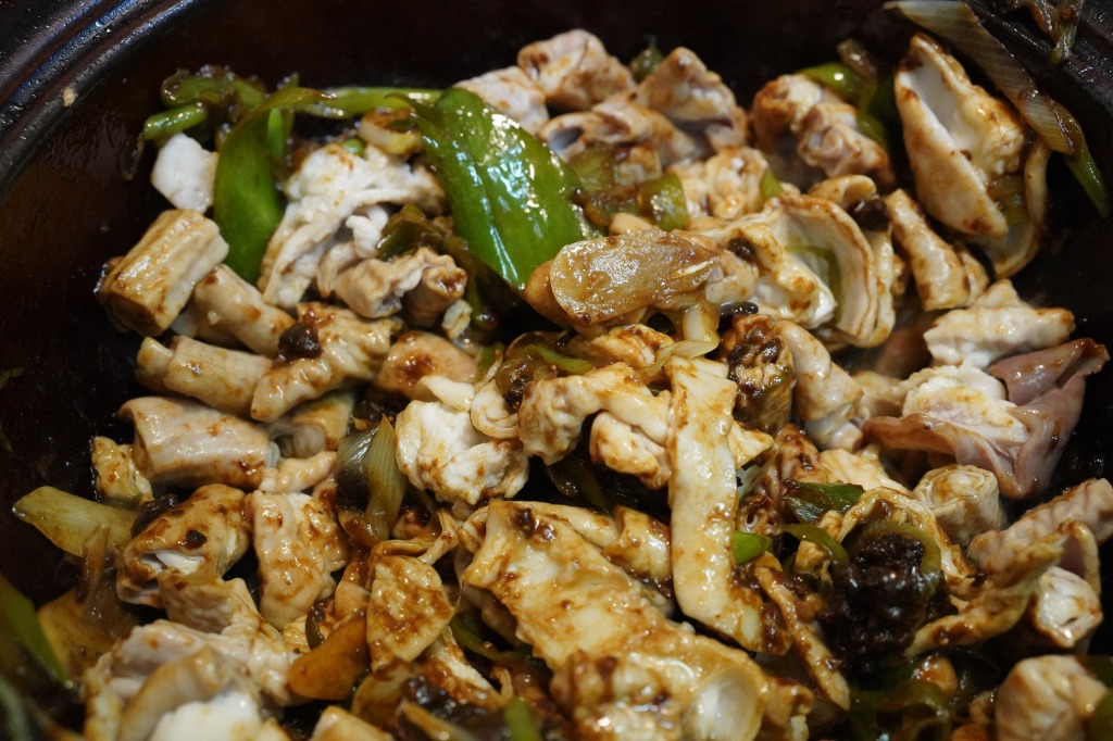 3.下処理済みの豚もつを加えて炒める。