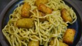 2.茹でたスパゲッティを加えて炒め、軽く塩を振ったのち、トマトケチャップ:ウスターソース=3:1にレモン汁を加えたソースを加えてさっと絡ませ、ナポリタンを完成させる。
