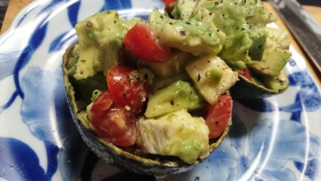 アボカドの器に盛られたさっぱりとしたアボカドサラダ