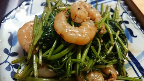 シンプルな組み合わせと調味、海老と青菜のオイスターソース炒め