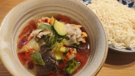 激辛竹富島ラー油を使った、具沢山つけ汁で食べる冷麦