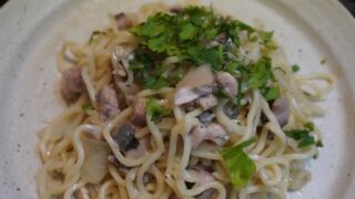 カラヒグ麺を使った、ポルチーニ茸と豚肉のクリームスパゲッティ