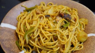 ウスターソースをがっつり使った、太麺ドライカレースパゲッティ
