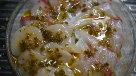 スギ:別名クロカンパチだが、こいつらスズキ目スギ科。意外といい白身で美味いので、ホタテ貝柱とともに、カルパッチョに。柚子胡椒とEXVオリーブオイルと塩で、さっぱり美味しく。白ワインにも日本酒にもどちらにも。■材料・スギ(食べたいだけ)・ホタ...