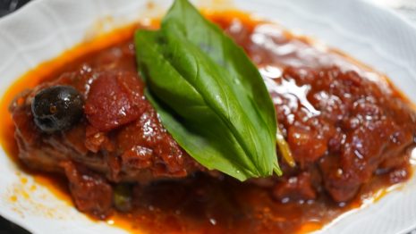 鍋に全部突っ込んで煮るだけ、豚バラ肉と黒オリーブのトマト煮