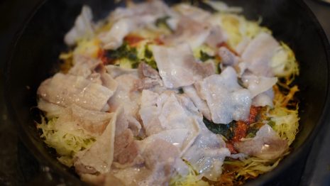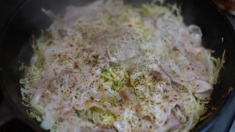 フライパンのまま出す千切りキャベツ豚アンチョビ焼き