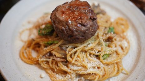 ハンバーグを崩して混ぜて食べるデミソースのスパゲッティ