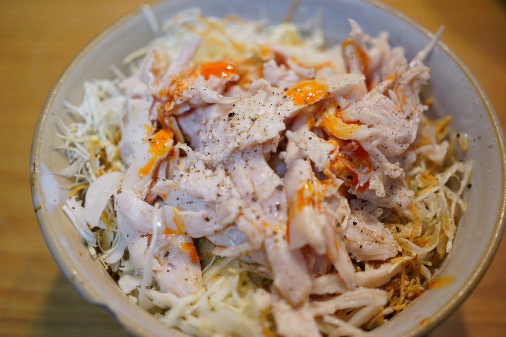 1.千切りキャベツと無限キャベツのもとを混ぜて丼に盛ってサラダチキンを乗せてラー油をかけて完成。