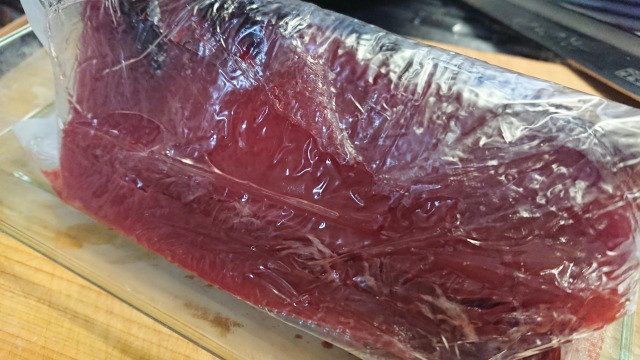 1.鰹の切り身を脱水シートで巻いて冷蔵庫保管。だいたい90分放置。