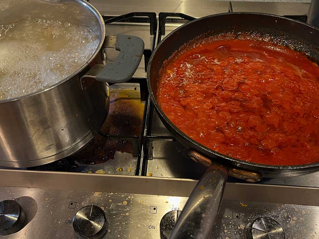 3.2にトマトピューレを加えて煮る。塩で味をつける。同時にペンネを茹でる。塩は湯に入れませんが代わりに乾燥舞茸を入れて、味わいをほんのりとパスタに移す。