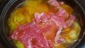 3.2を火にかけ加熱。一旦煮えたら火を弱火にして、牛薄切り肉を加えて煮て完成。良い具合でネギとキノコと一緒に食べる。黒七味をかけてもいい。
