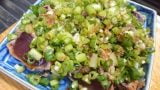 2.刻んだ大葉と実山椒を1に乗っけて、EXVオリーブオイルをかけて完成。