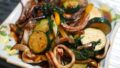 2.適当に切った玉ねぎとミニトマトを用意し。フライパンに1とともに挟み、白ワインとローリエを加えて蓋をして加熱。玉ねぎがしんなりするくらいまで加熱したら、塩で味を整え、ワインは適当に煮詰め、皿に盛り付けて完成。