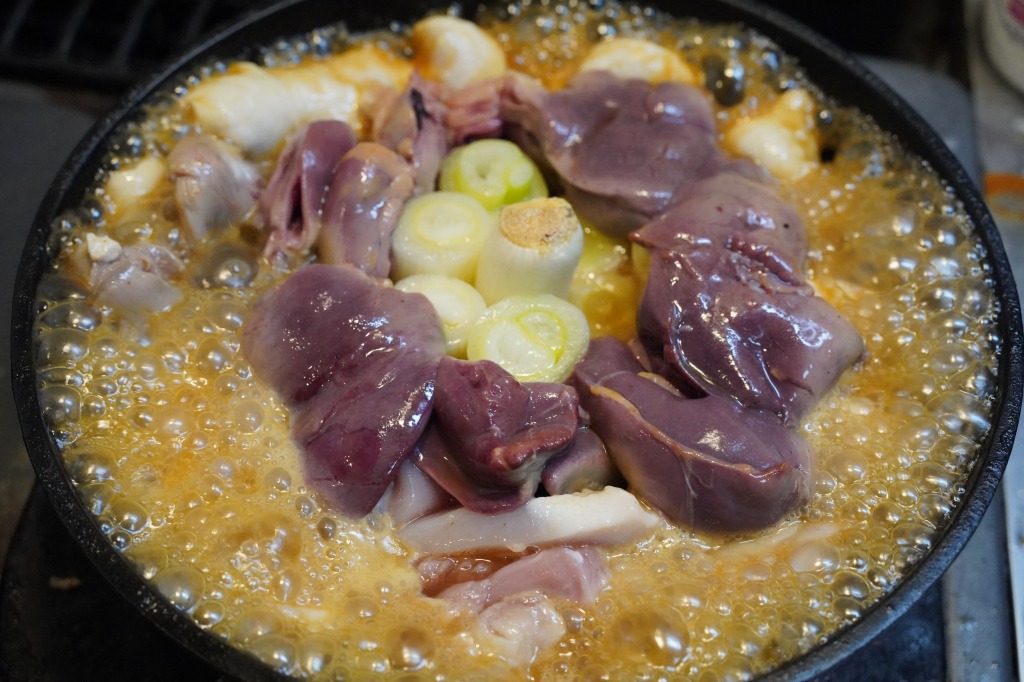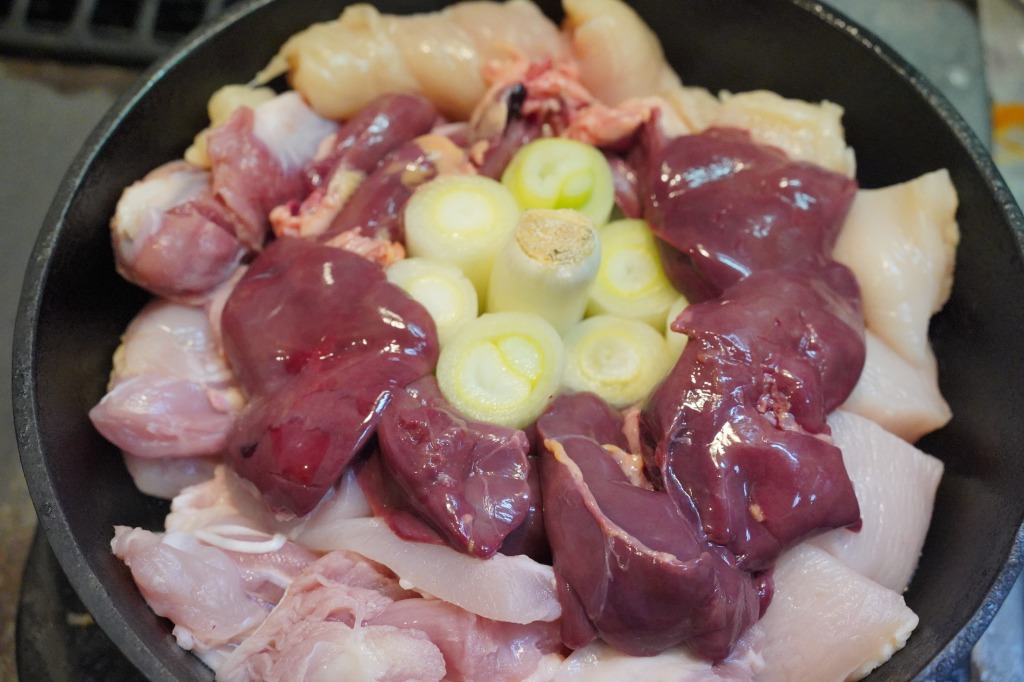 1.鶏肉はぶつ切りに、砂肝は隠し包丁を入れ、ハツはレバーから切り離し半割にして血の塊などをl除去する。ネギは筒状に切り揃える。
