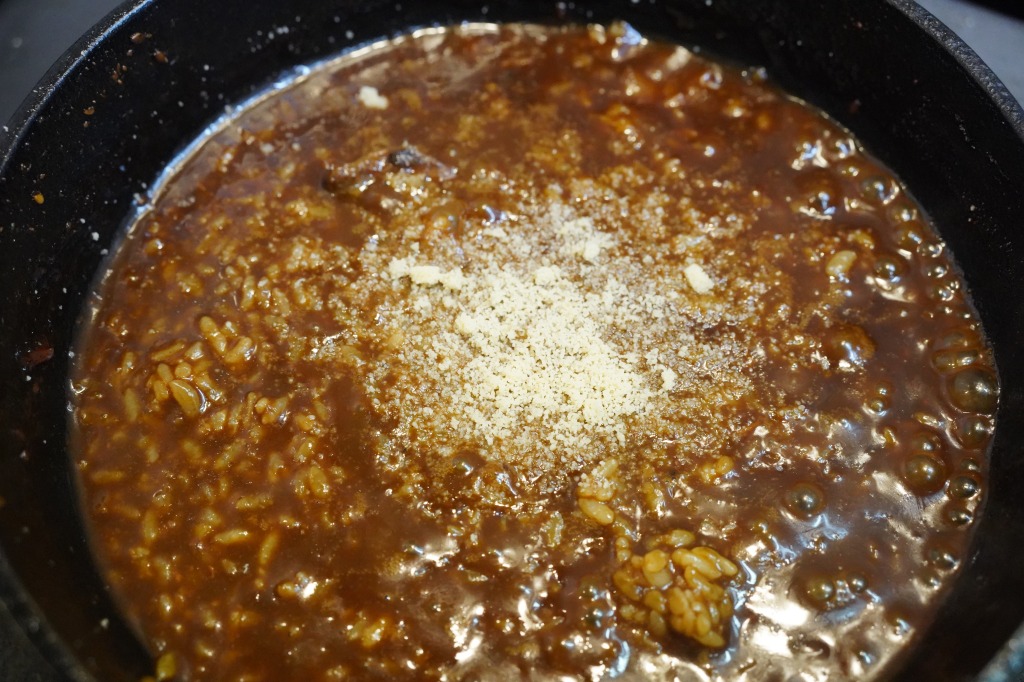 5.具材がなくなって汁だけになったら、ご飯を加えて加熱して和えて最後に粉チーズをかけて、リゾット風に締めておしまい。