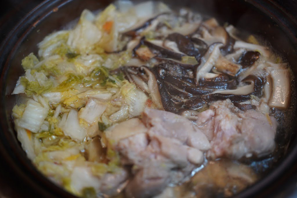 1.鍋に白菜漬と適当に切った鶏もも肉と生椎茸を入れる。白菜漬に入っている汁は捨てない。